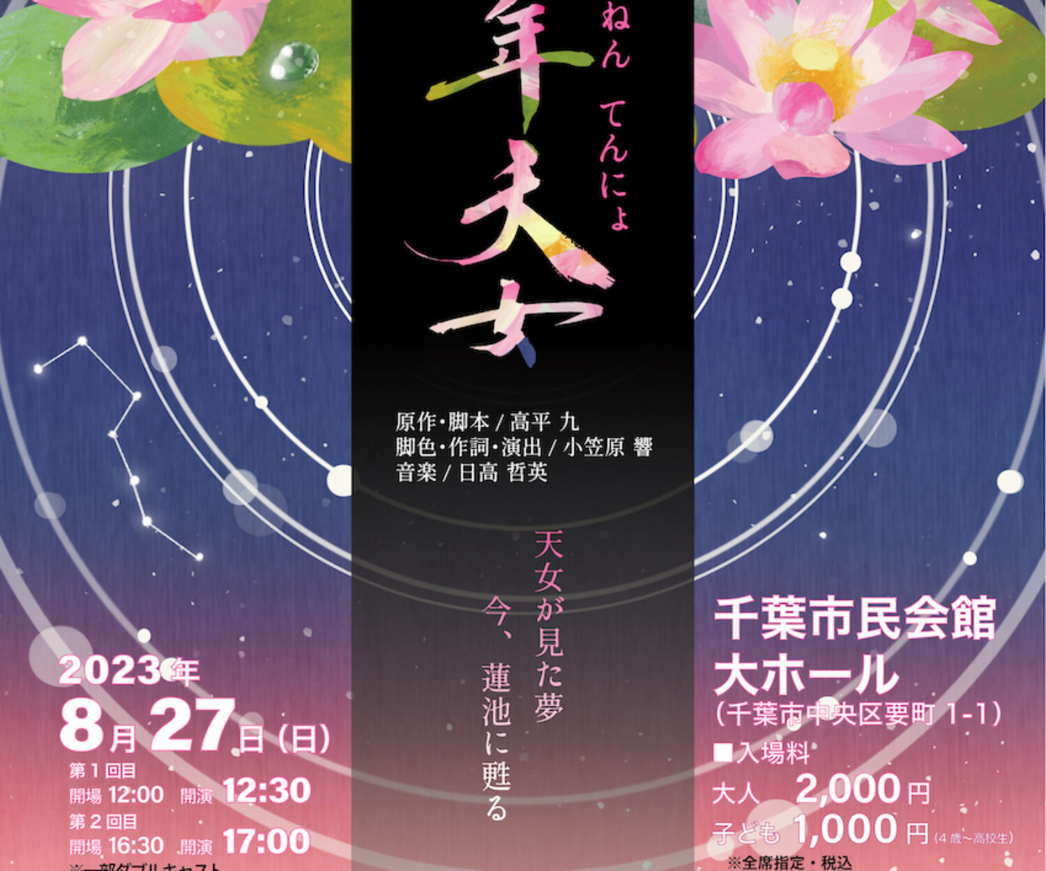 Past 14 8月 2023 「千年天女」千葉市民創作ミュージカル2023 千葉市文化振興財団主催の市民ミュージカルの音楽を担当致しました。 千葉市にふさわしい、地元の歴史に基づいた作品です。 市民とスタッフが一丸となって、最高の舞台ができそうです。 自分でも気に入った楽曲が揃いました。 歌にも期待してくださいませ! 原作・脚本/高平九 脚色・作詞・演出/小笠原響 音楽/日高哲英 2023年8月27日(12:30 17:00) hidaka
