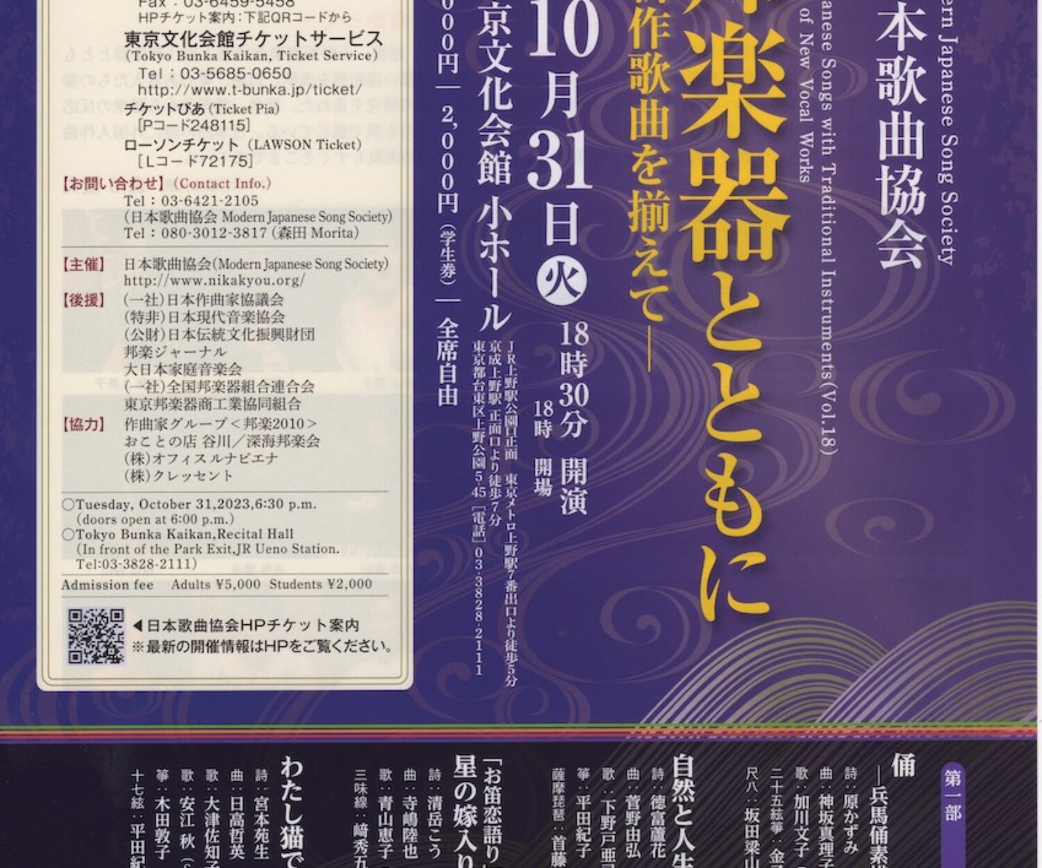 Past 17 10月 2023 わたし猫ですわ(2人のソプラノと箏、十七弦箏のために) 演奏会にて新作初演をいたします。 日本歌曲協会主催、第18回「邦楽器とともに」 -新作歌曲を揃えて- 10月31日 18時30分開演 東京文化会館小ホール 詩人の宮本苑生さん詩集「わたし猫ですわ」から4編を、 2人のソプラノ、箏、十七弦箏の、12分ほどの作品致しました。 日本歌曲協会は和楽器(邦楽器)の伴奏で歌の作品を世に生み 出したいとの想いがあって作られた団体です。 今回初参加ですが、楽しみたいと思っております。 hidaka