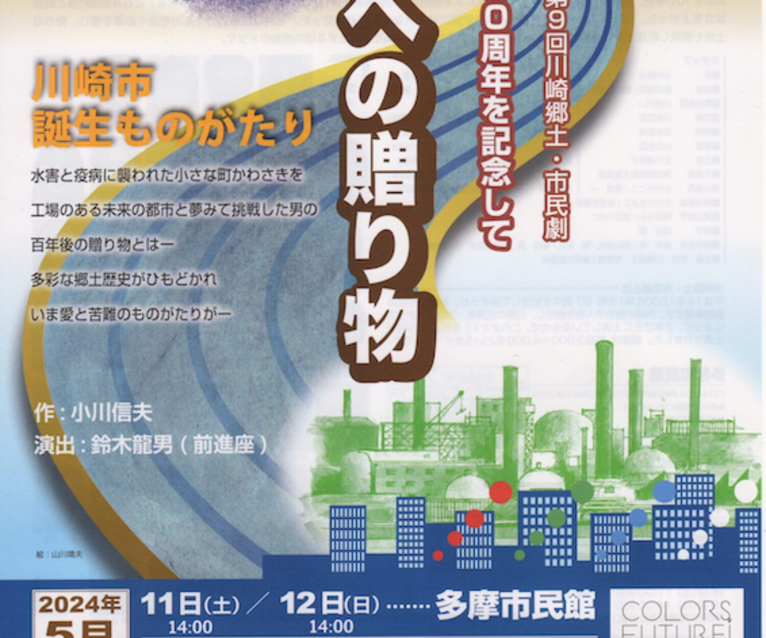 Past 09 5月 2024 百年への贈り物(川崎郷土・市民劇) 川崎市民による市民劇の音楽を担当いたしました。 川崎郷土・市民劇上演実行委員会が中心となって制作を進めております。 私は今回で3回目の参加。 多摩市民館と幸市民館の2箇所での上演です。 川崎市と縁の深い小川信夫さんの台本による作品です。 京浜協同劇団劇団の心強い協力も加わって、川崎市民による川崎の物語が始まります! hidaka