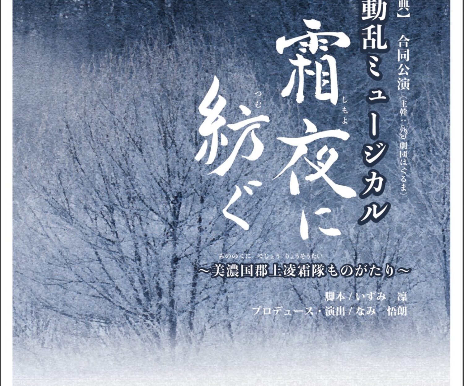 Past 10 9月 2024 霜夜に紡ぐ(劇団はぐるま) ミュージカルの音楽を担当いたしました。 劇団はぐるま合同公演「霜夜に紡ぐ」 幕末、岐阜の郡上藩士によって結成された「凌霜隊」 を中心に描いた歴史物語です。 邦楽器も取り入れた歌、音楽に溢れております。 脚本 いずみ凜 プロデュース・演出 なみ悟朗 10/19.20日 岐阜市文化センター hidaka