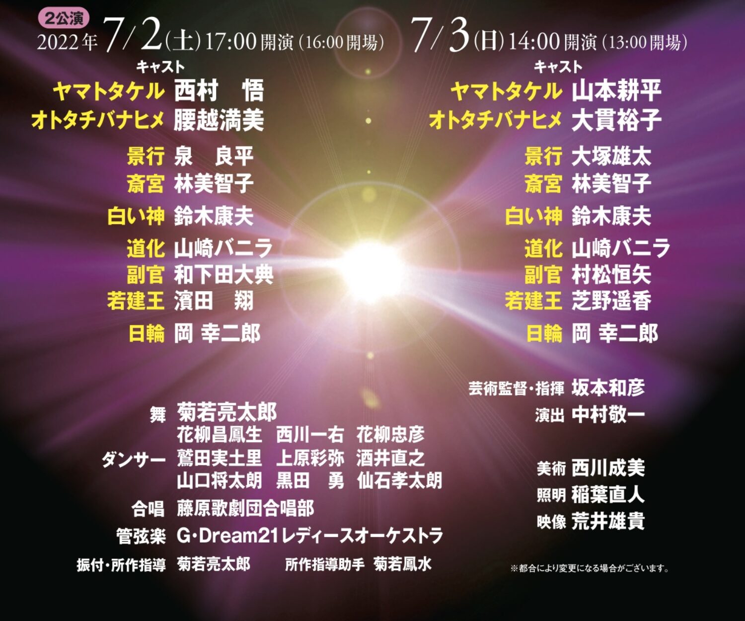 新国立劇場中劇場 2022年7月2日17時開演/7月3日14時開演 2021年5月に上賀茂神社にて上演されたオペラが新国立劇場にて再演です。 素晴らしいキャスト、藤原合唱団、フルオーケストラ、スタッフ、一丸となって 作品を作り上げるつもりです。 2021年上賀茂神社での初演は、境内での野外公演だったので、雨が降ったら 中止の公演でした。その日は昼過ぎから雨が降り始め、そして次第に強くな っていき、ついに本格的な雨となってしまったのです。 皆、中止を覚悟していたのですが、開演3時間ほど前から急速に雲が去り、 雨が上がってしまったのです。開場時には、何とか野外で雨で濡れていた 椅子を拭いて、お客様をご案内できました。 そして、開演時には星が瞬き始め、天空には北斗七星が輝いておりました。 神様がオペラ公演の前に、雨で浄めてくださったのでしょうか。 神様がヤマトタケルの公演を見守ってくださった、そんな心境でした。